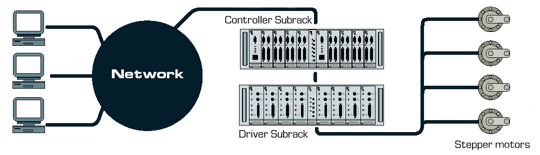 A complete motor control system consists of three main enclosures, Controller Subrack and two Driver Subracks. The Controller Subrack is responsible for taking input control signals from the control system and conditioning them for the Driver Subrack, which in turn directly drives the motors. Each subrack is a standard 3U Eurocard rack and requires +12V to +24V DC input power. Control signals are sent via Ethernet to the system, which appears as a standard EPICS input/output controller (IOC).